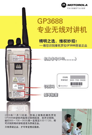 摩托罗拉GP3688 GP3688 是摩托罗拉最新款的手持双向无线电对讲机,具有通话时间长的特点,低功率模式下可达 19 小时,而高功率模式下可达 14 小时,能提高工作效率。此款无线电对讲机十分轻巧,采用符合人体工程学的设计,具备新的电池保险闩功能,可将电池紧扣到对讲机上,以进行持续的通信。它也可以通过 PROIS 协议命令进行简短的数据传输应用和刷新选件板。
